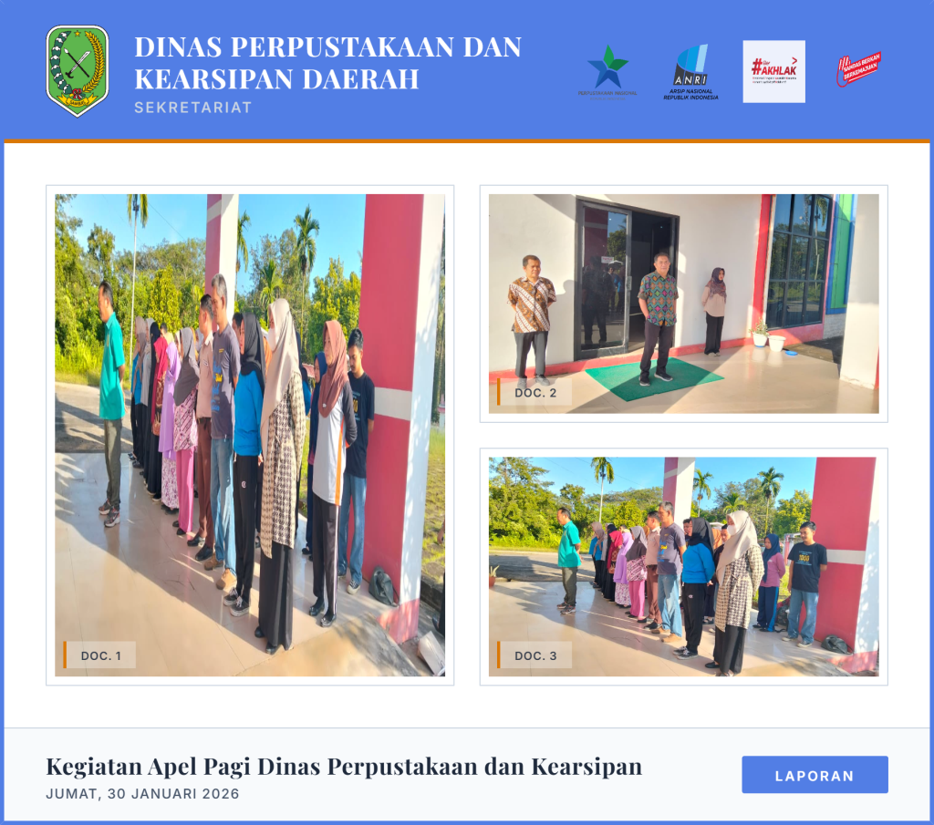 Sambas-Jumat, 30 Januari 2026 Apel Pagi di Lingkungan Dinas Perpustakaan dan Kearsipan Daerah Kabupaten Sambas yang di pimpin oleh Sekretaris Dinas.
