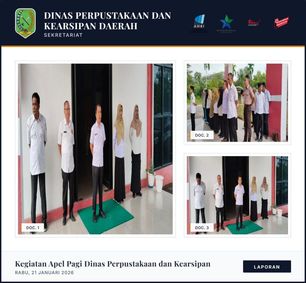 Sambas- Rabu, 21 Januari 2026, Apel Pagi Rutin di Lingkungan Dinas Perpustakaan dan Kearsipan Daerah Kabupaten Sambas, Apel Pagi di Pimpin Oleh Kepala Bidang Pengembangan dan Pembudayaan Gemar Membaca.